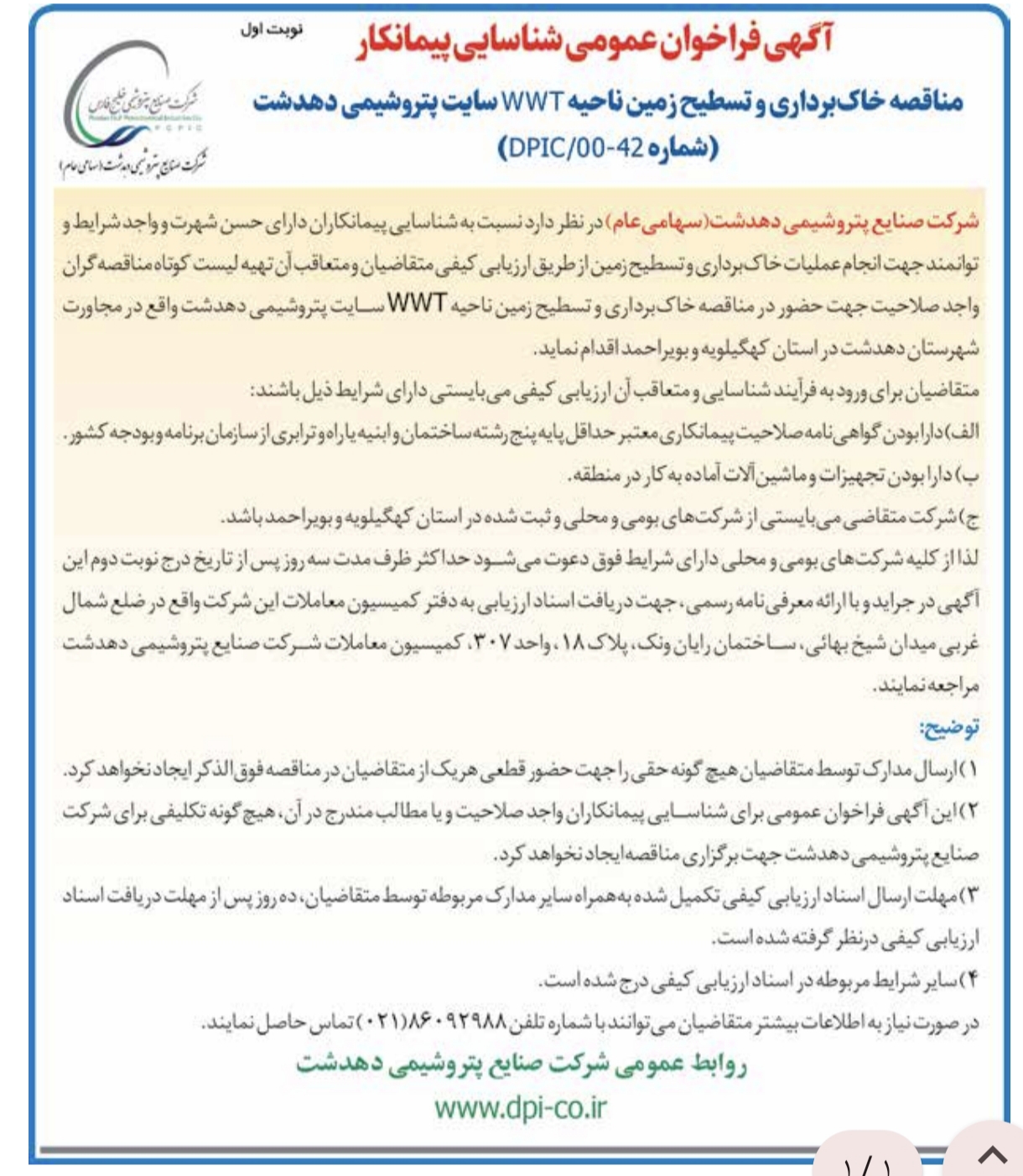 آگهی فراخوان شناسایی پیمانکار مناقصه خاک برداری و تسطیح زمین ناحیه WWT سایت پتروشیمی دهدشت